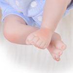 She has plump rosy cheeks, hand-painted lips, finger and toenails, and her knees, hands and feet are reddish.